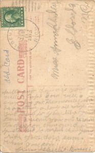 This post card was addressed to Miss Anna Chandler of Eldorado, NC, from Shirlie Russell. I think this is Anna Russell Chandler and her brother John Shirlie Russell. Would he have addressed the card Miss? I’m not sure of all the words, especially since I’m not familiar with the handwriting. Does anyone else find the card itself as amusing as I do?