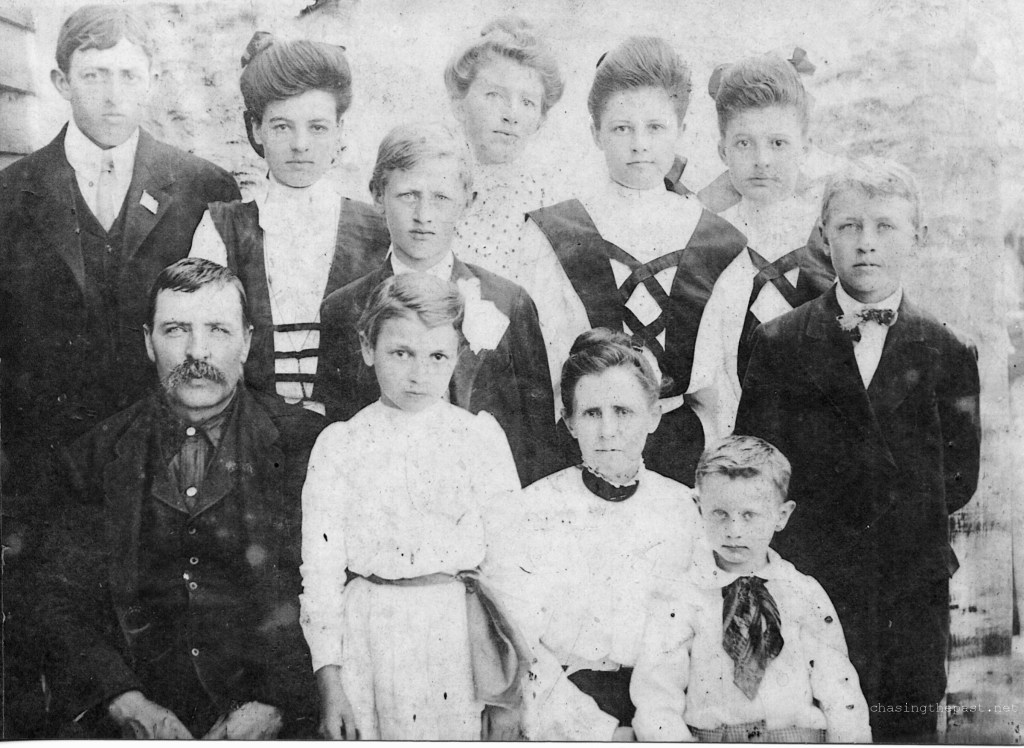 Squatting are Peck (Henry), Charlie, & Walt Standing from left are Alice, Minnie, Stella, John Sutt Morris, Lanta Morris, Caroline Hall Morris, Myrtle Lou.