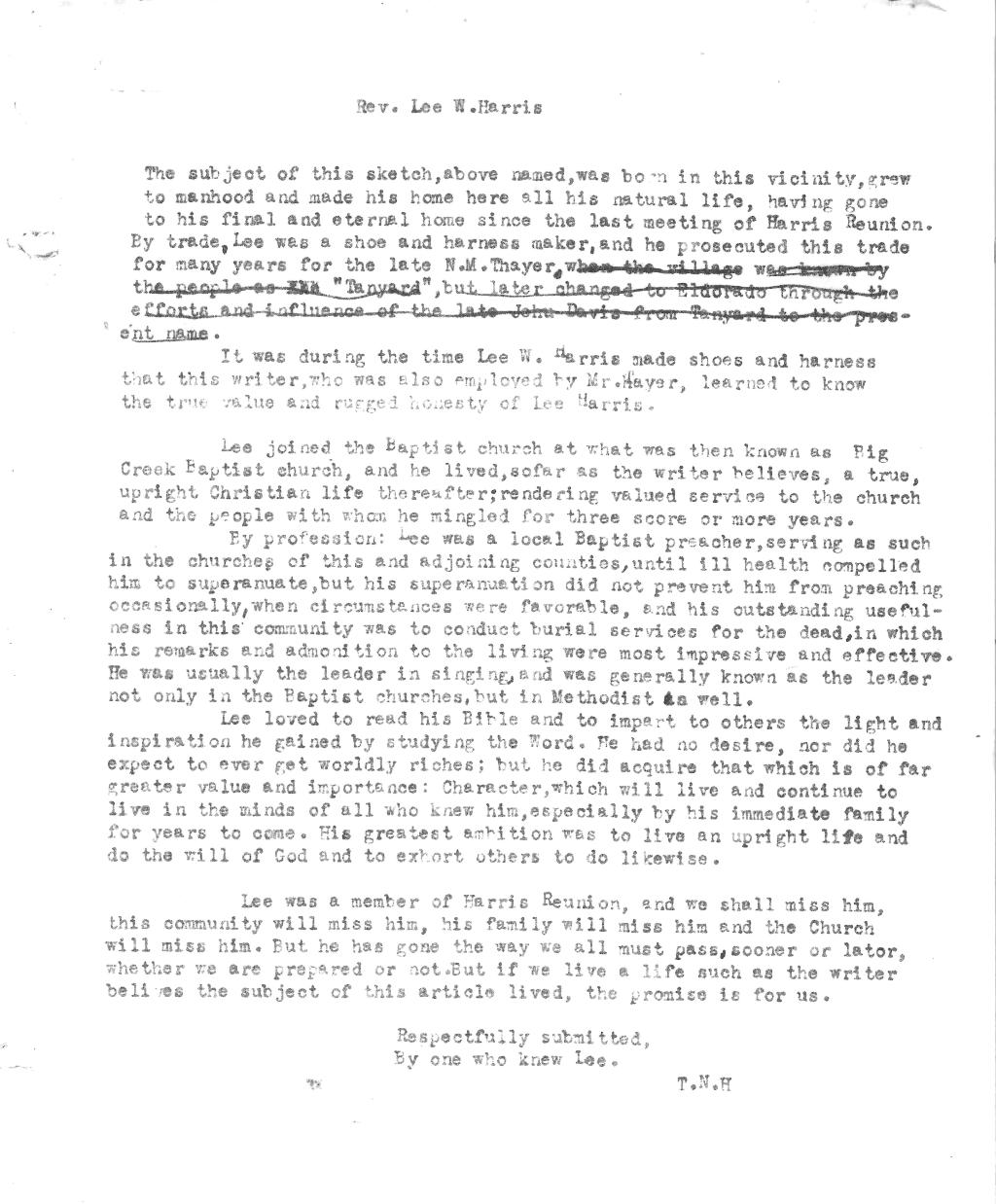 The subject of this sketch, above named, was born in this vicinity, grew to manhood and made his home here all his natural life, having gone to his final and eternal home since the last meeting of Harris Reunion. By trade, Lee was a shoe and harness maker, and he prosecuted this trade for many years for the late N.M. Thayer, when the village was known by the people as “Tanyard”, but later changed to Eldorado through the efforts and influence of the late John Davis from Tanyard to the present name.