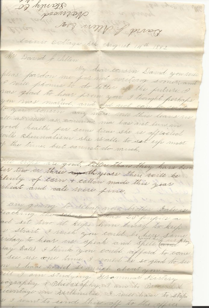 I’ll post the rest of this letter as well as the envelop tomorrow. As the envelope is postmarked Toledo, Ark, I started looking around that area to help me figure out just what the word was before Cottage. I’m still not convinced it says Locust, but there is a Locust Cottage just north of Toledo, Ark on an 1883 map.