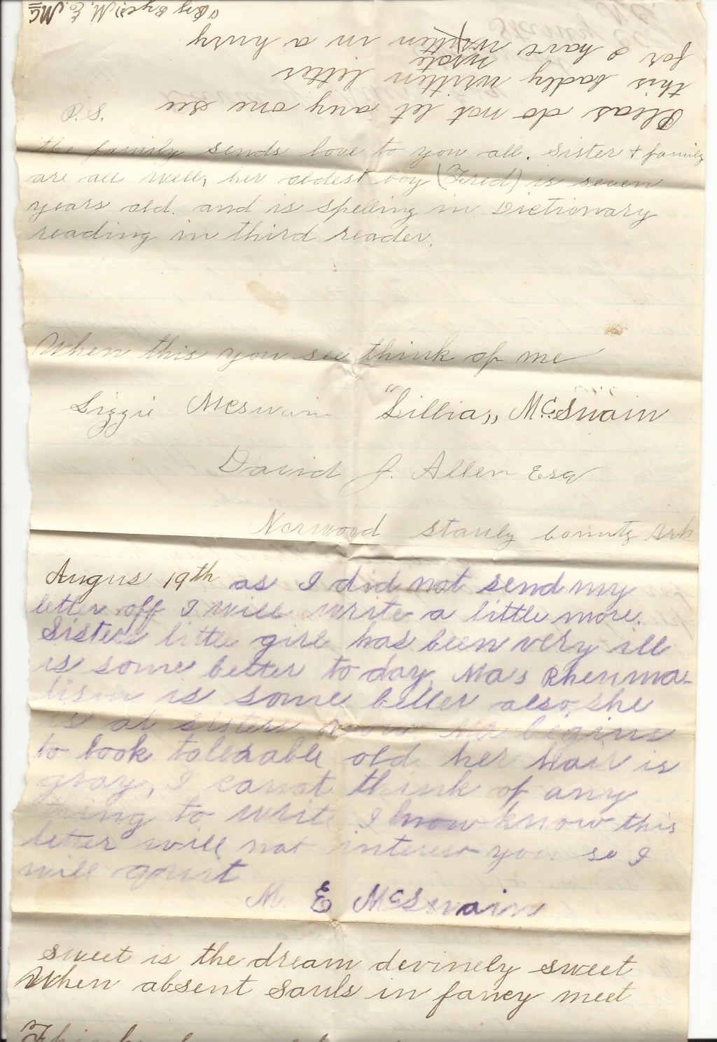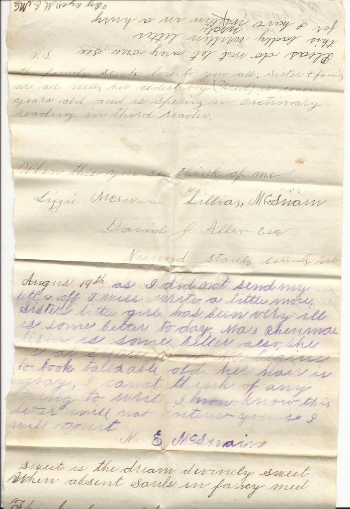 This is the back side of the yesterday’s post. I believe M. E. Lizzie McSwain is Martha Elizabeth who was born in Arkansas in 1862. She would be the first of M and Lucy’s children to be born there, the elder children being born in North Carolina. I believe Lizzie later married Charles Kendall, also of North Carolina, and lived out her years in Jefferson County, Arkansas. Whether she ever visited NC, I am not sure.