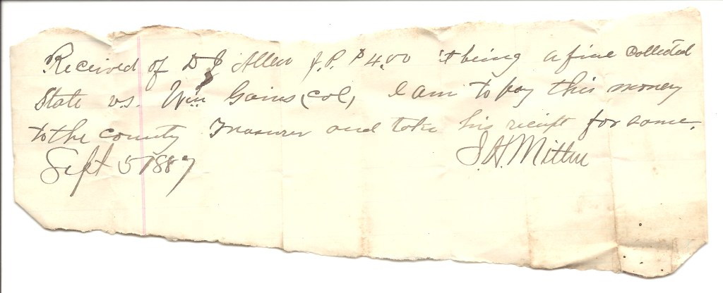 Yet again, I’m unsure of the name. My best guess is SH Milton, but I cannot find anyone like that on an 1880 or 1900 census. The person for whom the fine is due looks to be Wm Gaines, colored. I’ve found a William Gaines, 48, on the 1900 census living in Lilesville. I’m not certain, of course, that it’s the same person and need to see if I can find any court records to document. A $4 fine back then seems to indicate, at least to me, a more serious crime.
