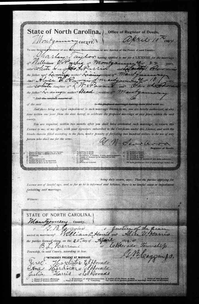 Alice was born to Lee and Sarah Russell Harris on October 8, 1875. She grew up in the Eldorado Community in Montgomery County, NC. In 1880, she lived with her parents. She had a brother who died at 6 months old in December 1877. Her mother, Sarah, died and Lee soon married again and had several children. His second wife was Nancy Elizabeth Russell. With Nancy, he had Bulah, Travis, Silvia, Oscar, Jessie, and Georgie.