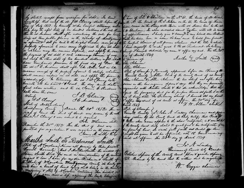- “Montgomery, North Carolina, United States records, Aug 5, 2018,” images, FamilySearch (https://www.familysearch.org/ark:/61903/3:1:3QS7-L96S-J7NX? view=fullText : Mar 18, 2024), image 293 of 1205; Martha Smith to Richmond Smith.