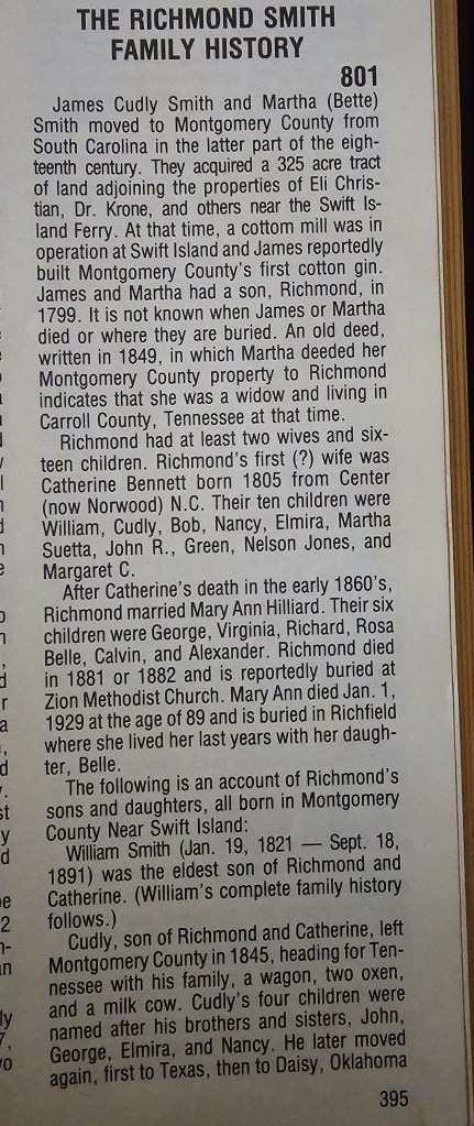 Cousins Helen Crepps and Brenda McIntyre provided an article in Volume I of the Montgomery County Heritage Book. While it was about the Richmond Smith family, they do mention his parents James and Martha. Much of this information matches what cousin Carmie said.