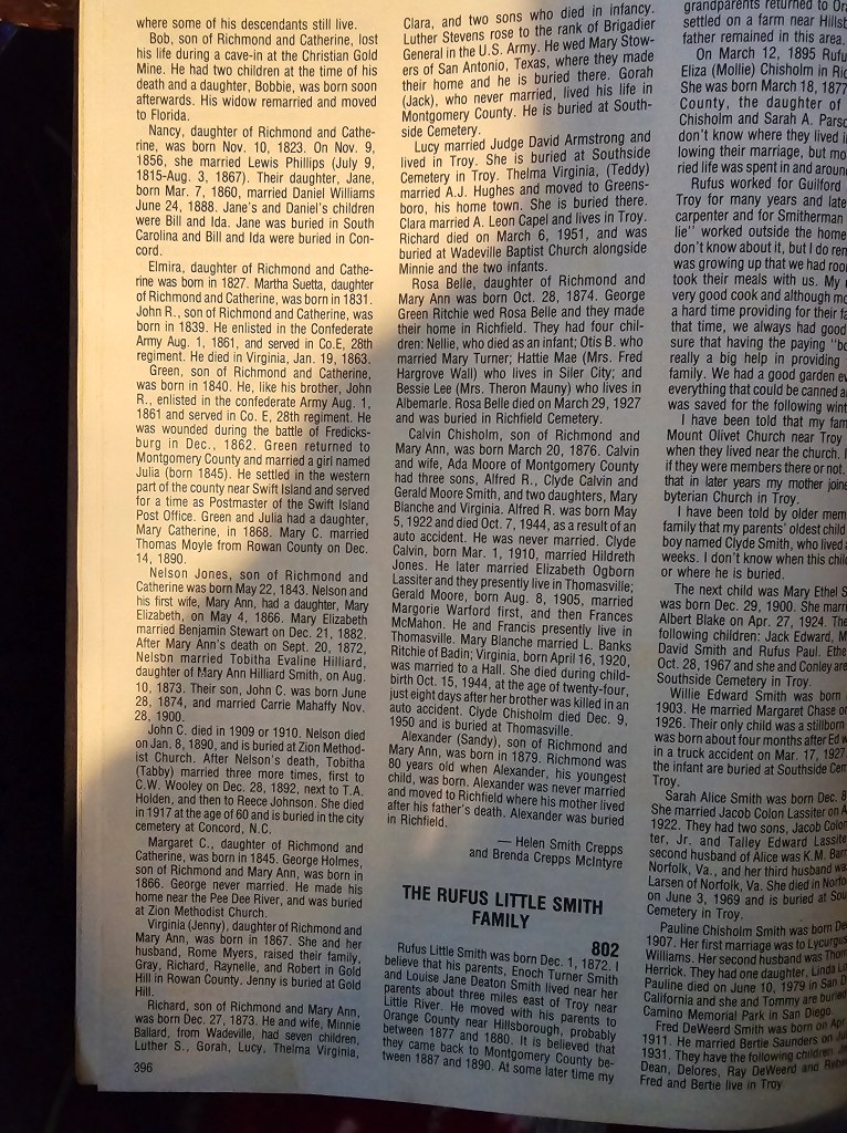 - Helen Crepps & Brenda Crepps McIntyre. “The Richmond Smith Family History” The Heritage of Montgomery County, North Carolina / The Heritage Book Committee: Winnie Ingram Richter, editor … [et al.] Winston Salem, N.C. : Montgomery County Historical Society in cooperation with Hunter Pub. Co., 1981. ISBN 0894591533. Article 801 Richmond Smith