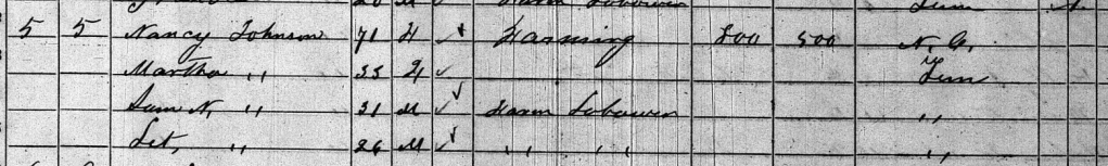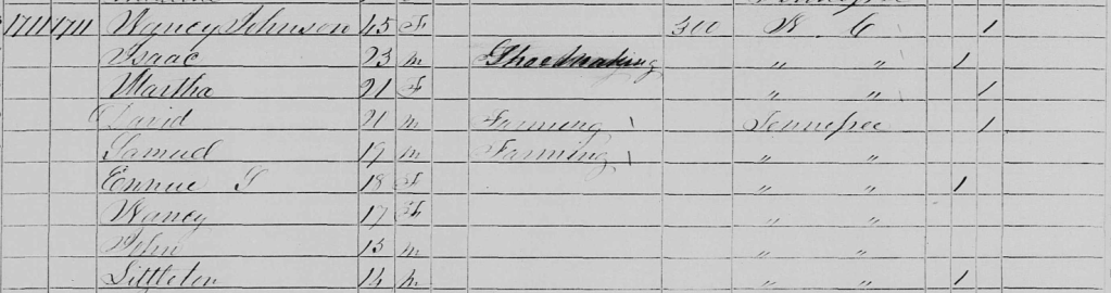 Although the ages are wrong, the children’s ages are closer-ish and the names match three of those she was living with in 1850. The 1850 census also supports them moving west about 1828. I believe Nancy’s age is incorrect. There are two Nancy Johnsons living in Carroll County, TN. The other one was born about 1788. While the age of this Nancy would match the age on this 1860 Census, this Nancy is found on the Census, age 74. Living alone beside the same people (Susan Orr) in which she was living in 1850 and 1840.