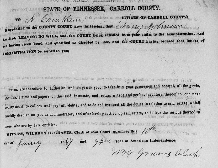 - “Tennessee Probate Court Books, 1795-1927,” images, FamilySearch (https://familysearch.org/ark:/61903/3:1:S7WF-ST3R-V9?cc=1909088&wc=M6QQ-ZNL%3A179638201%2C179810001 : 22 May 2014), Carroll > Inventories, 1867-1877, Vol. C > image 4 of 399; county courthouses, Tennessee. Nathan Cawthon Administrator for Nancy Johnson.