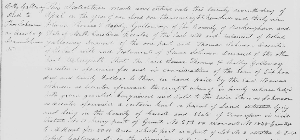 In 1844, a deed was recorded in Carroll County, TN between Rolly/Rawly Galloway, executor of Robert Galloway, of Rockingham County, North Carolina sold to Thomas Johnson, executor of Isaac Johnson, for a parcel of land in Carroll County, TN dated 27 April 1839.