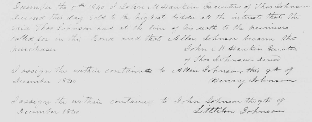 Interestingly, right after the sale, on 9 December, 1840, Henry Johnson assigns his interest to Allen and Littleton assigns his interest to John. So it would seem that after 1840, two Johnson brothers owned the grist mill, Allen and John.
