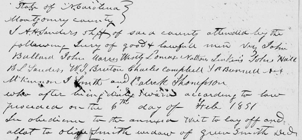 On page 20 of the 1851 file, there is a petition to “lay off and allot to Olive Smith widow of Green Smith Dec’d her dower and thirds in the lands of said Green Smith Dec’d”. John McLennan, Clerk of Montgomery County, commands the sheriff to “summon a jury of good and lawful men unnconnected with the parties by affinity or consanguinity.” Therefore, the Jonathan Smith found living on Green’s land cannot be related to Green Smith.