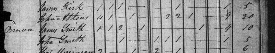 My first efforts were to find a John P. Smith in Montgomery County, NC or Carroll County, TN. According to the census records for James Smith in 17901 and 18002, the only possible years for John’s birth is between 1785 and 1790.