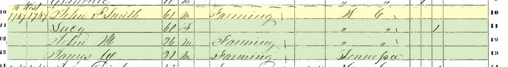 The National Archives in Washington D.C.; database with images, Ancestry (www.ancestry.com). Record Group: Records of the Bureau of the Census; Record Group Number: 29; Series Number: M432; Residence Date: 1850; Home in 1850: District 15, Carroll, Tennessee; Roll: 873; Page: 132a, Entry for John P Smith.